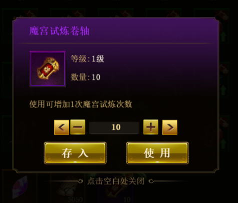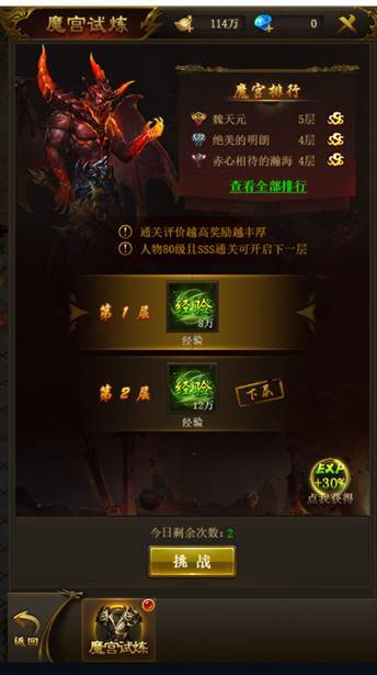 游戏每天都可以通关一定次数的魔宫试炼,可以获得超高经验!